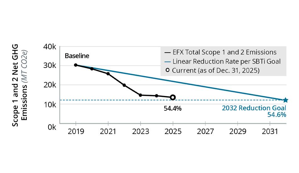 We set an SBTi-approved target to reduce absolute scope 1 and 2 greenhouse gas emissions 54.6% by 2032, from a 2019 base year. As of year end 2025, we have reduced our scope 1 and 2 emissions by 54.4%, bringing us to within 0.2% of our near-term reduction target.