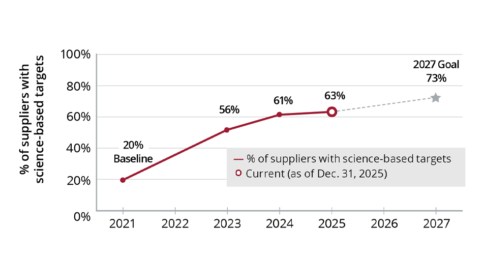 We set an SBTi-approved scope 3 supplier engagement target that 73% of our suppliers by spend, covering purchased goods & services and capital goods, will have science-based targets by 2027. As of year end 2025, 63% of our suppliers have set science-based emission reduction targets, reflecting meaningful progress from our 2021 baseline of 20%.