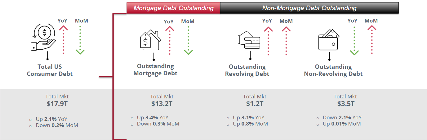 As of August 2025, outstanding mortgage and revolving consumer debt continue to climb year-over-year; non-revolving has slowed year-over-year, but rose month-over-month.²