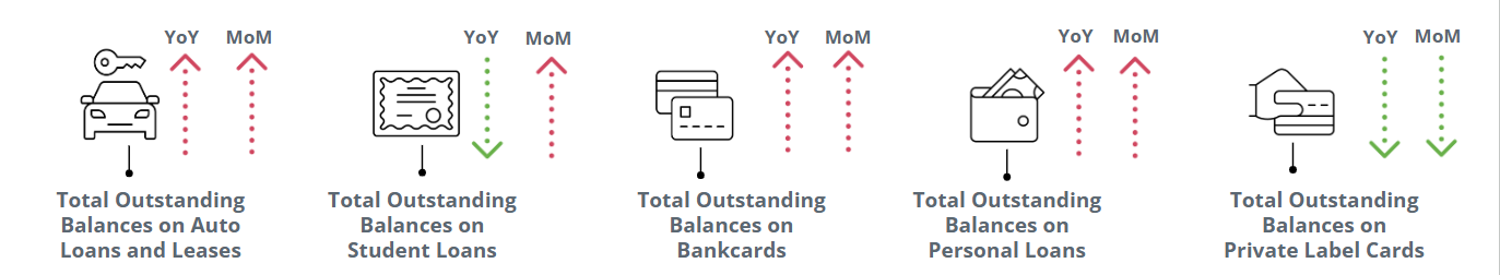 As of August 2025, non-mortgage outstanding consumer debt has increased for auto, bankcards, and personal loans year-over-year. Student loans and private label cards continue to be lower.²