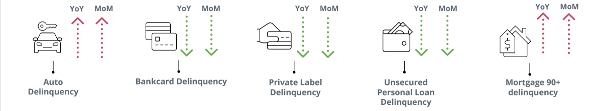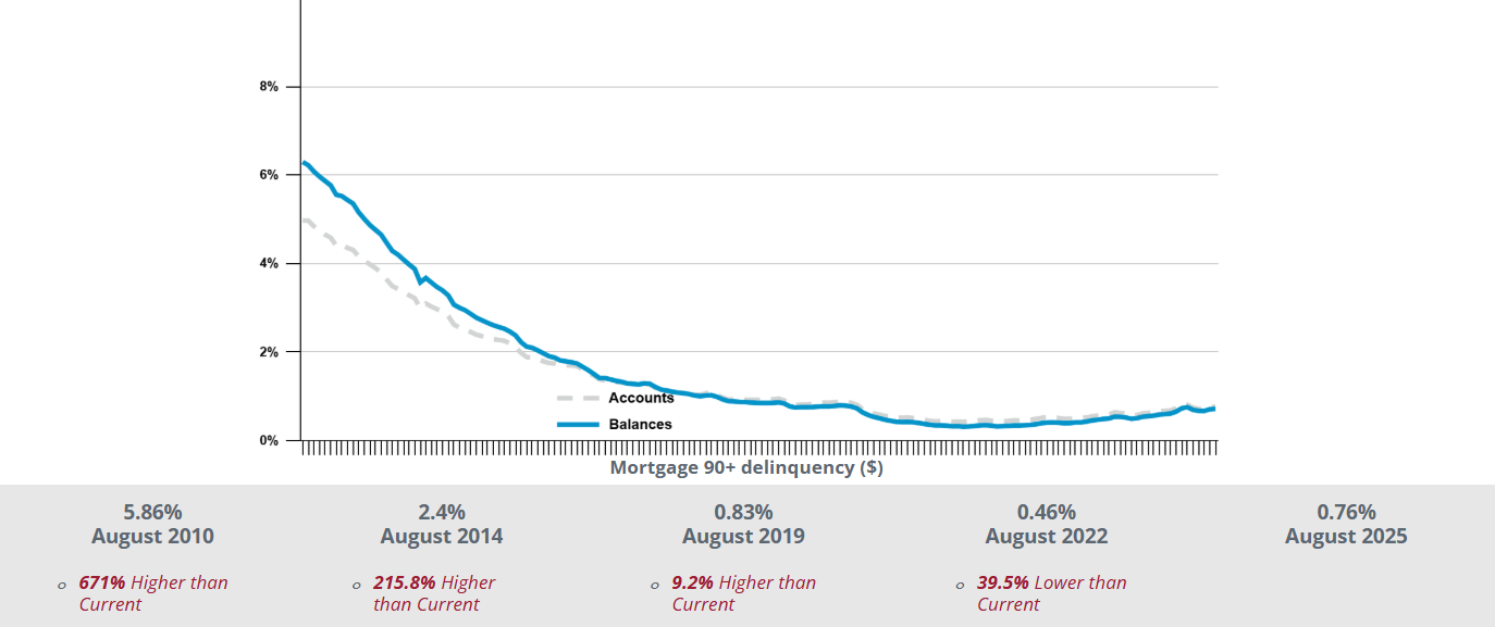 August 2025 delinquencies for mortgage and auto increased year-over-year, while bankcard, private label, and personal loans improved year-over-year.²