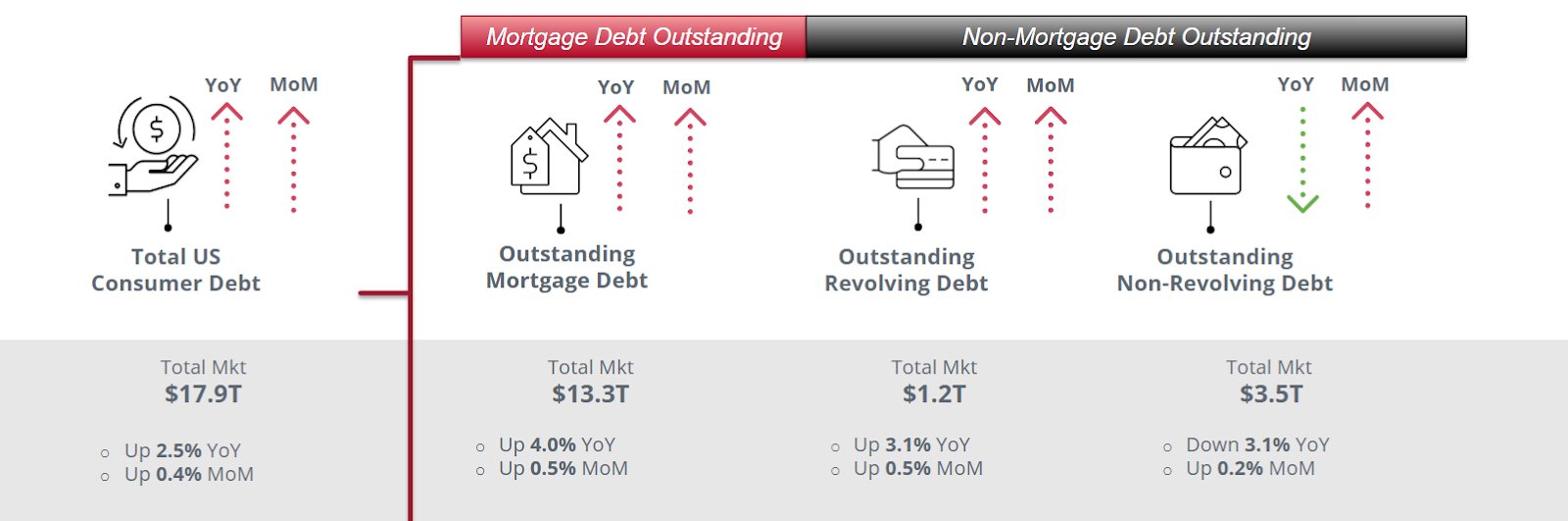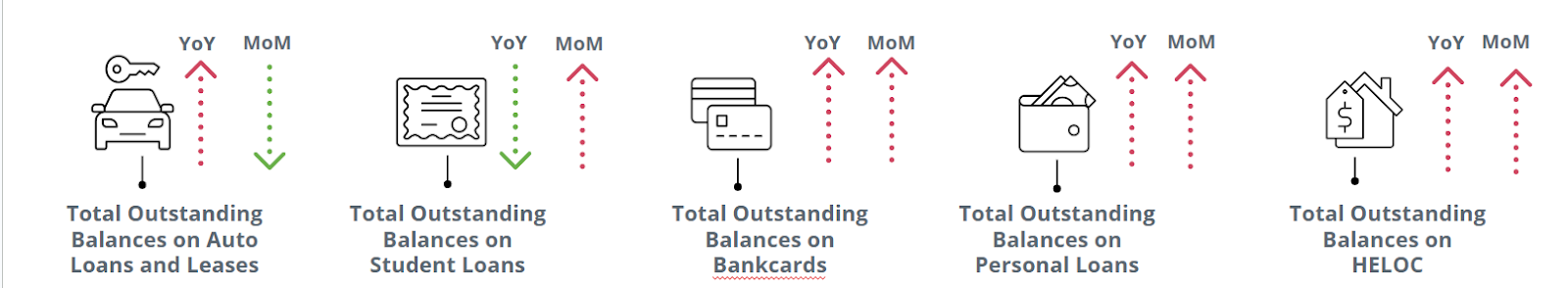 As of July 2025, non-mortgage outstanding consumer debt has increased for auto, bankcards,personal loans, and HELOC (Home Equity Line of Credit) year-over-year. Student loans continue to be lower.²