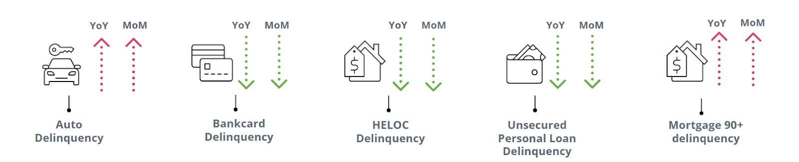 July 2025 delinquencies for mortgage and auto increased year-over-year, while bankcard, HELOC, and personal loans improved year-over-year.²