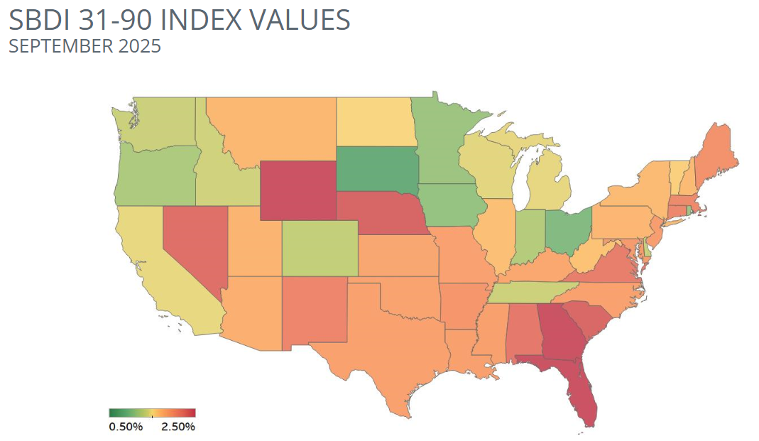 Meanwhile, the Equifax Small Business Delinquency Index (SBDI) 31-90 Days Past Due decreased 4 basis points from 1.76% in August to 1.72% in September 2025. The 31-90 SBDI decreased 10 basis points (6%) year-over-year. The SBDI 91–180 days past due remained level at 0.71% from August 2025 to September 2025. The Small Business Default Index (SBDFI) remained level at 3.26% and was down two basis points month-over-month.