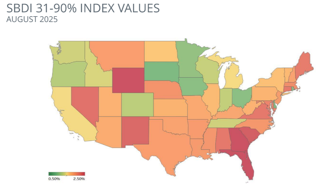 Meanwhile, the Equifax Small Business Delinquency Index (SBDI) 31-90 Days Past Due remained flat at 1.76% in August 2025. The 31-90 SBDI decreased five basis points year-over-year. The SBDI 91–180 Days Past Due increased slightly (1 bp) to 0.72% from July 2025 to August 2025. The Small Business Default Index (SBDFI) decreased slightly to 3.29% and was down three basis points month-over-month.