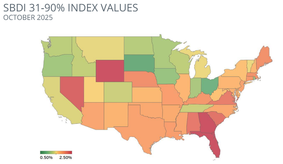 Meanwhile, the Equifax Small Business Delinquency Index (SBDI) 31-90 Days Past Due measured 1.69% in October, down three basis point month-over-month and down 13 basis points from October 2024. The SBDI 91–180 days past due remained level at 0.71% from September 2025 to October 2025. The Small Business Default Index (SBDFI) measured 3.23% and was down six basis points month-over-month.