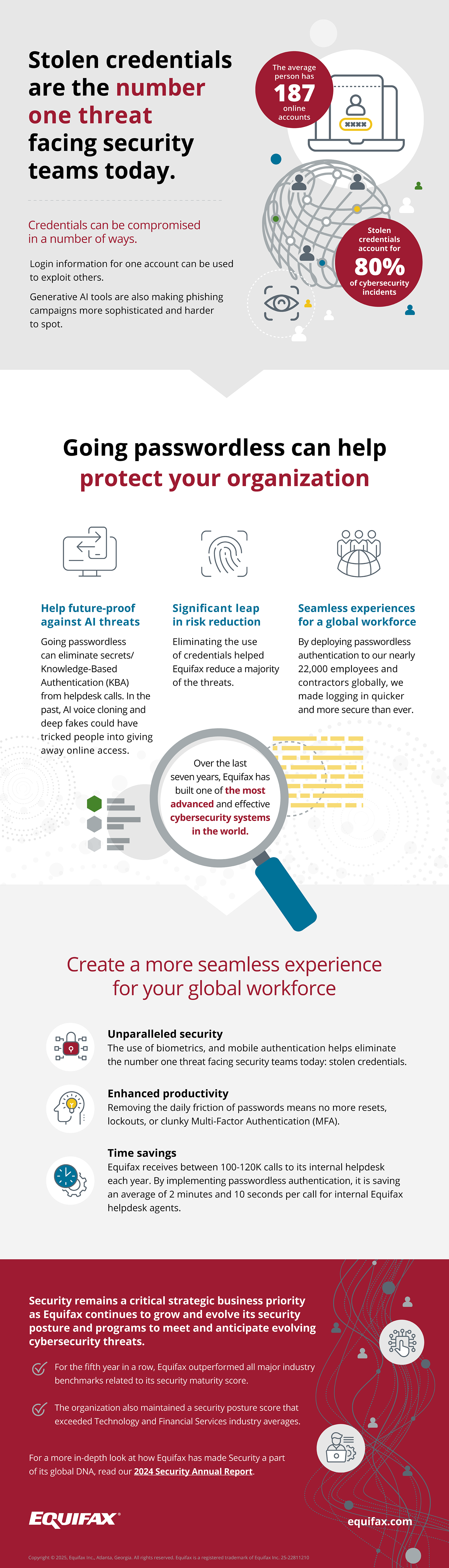 AS CYBERSECURITY AWARENESS MONTH KICKS OFF, EQUIFAX IS SHARING A CLOSER LOOK at its early adoption of passwordless authentication. Launched at the end of 2024, it is one of the ways the organization continues to strengthen its cybersecurity defenses and build on one of the world’s most advanced, effective, and transparent security programs. The industry-leading initiative saw nearly 22,000 global employees and contractors transition to a passwordless model, effectively helping slash help desk costs, enhance productivity and future-proof the organization against fast-moving AI impersonation tactics, like voice cloning.
